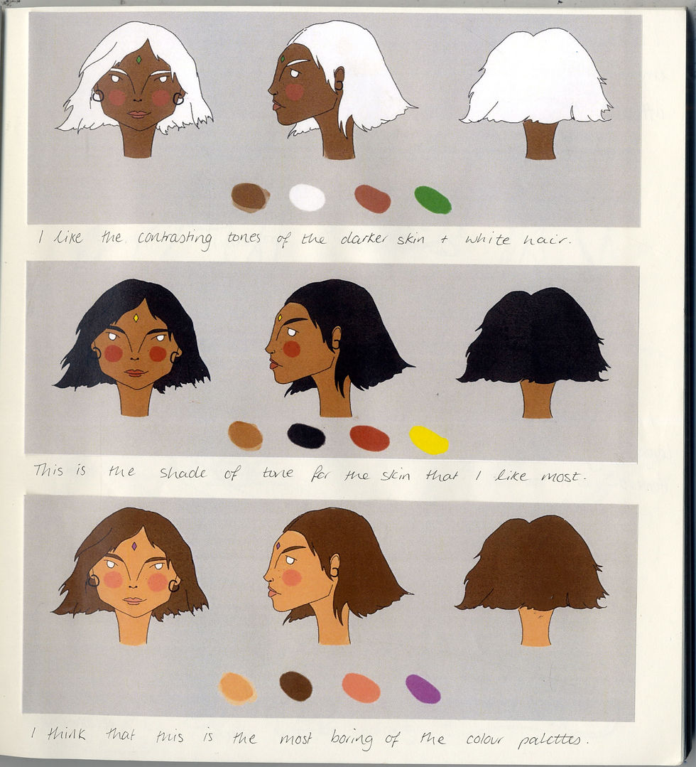 I really like the contrasting tones of the darker skin and the white hair, but the skin tone I like the most is with the black hair and yellow gem. I think that the bottom variation of colour palette is the most boring.
