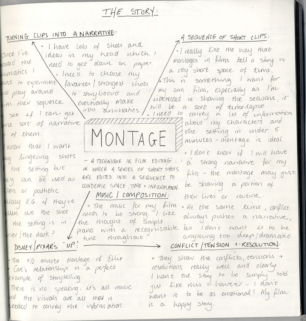 I have spent the majority of my time exploring how I want my film to look and in turn I have put the story side of it on the back burner. Now that I have a better feel of the aesthetic I want to start looking at the actual narrative; what exactly is going to happen and when. I'm very interested in the use of montage for story-telling and it's something I'm going to look at and consider for my animation.